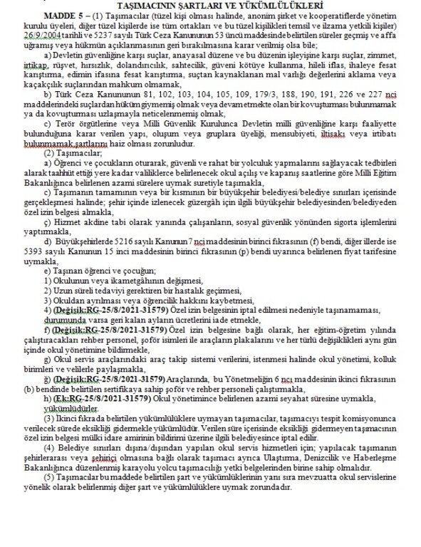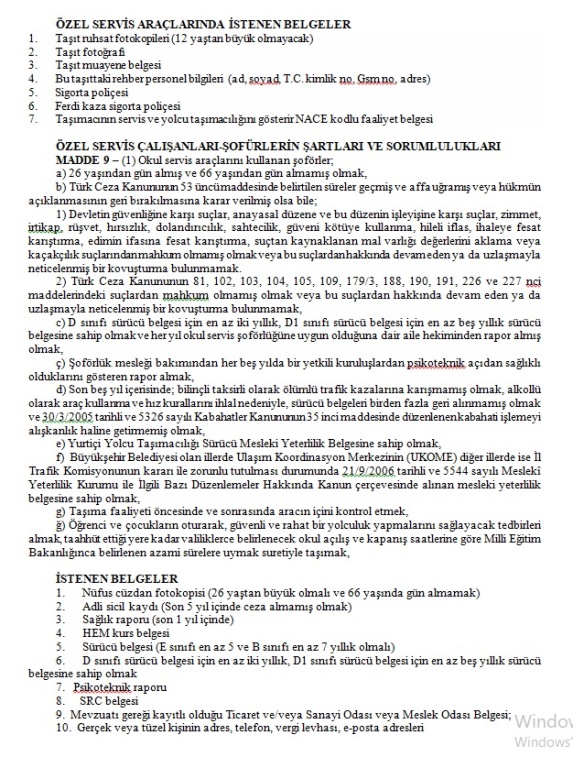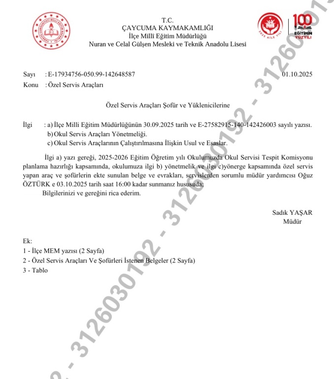 İlçe milli eğitim müdürlüğünün 30.09.2025 tarihli yazısı gereği, özel servis işleten ve okulumuza taşımacılık yapan yüklenici, taşımacı ve şofürlerin yönetmelik gereği taşıma işini yapabilmeleri için gerekli evrak belge ve işlemleri paylaşılan yazılarda belirtilen hususlar çerçevesinde vermeleri gerekmektedir. 03.10.2025 tarihinde kadar açıklamalarda belirtilen evrakları okul idaresine vermenizi rica ederiz.